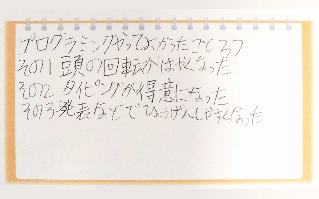 プログラミングのよさは取り組んだ結果がすぐに目の前に反映されることです。そこから「では次はどんなことをしようかな?」「どうにもうまくいかないけど、どこが原因かな?」とすぐその場でじぶんなりに考えながら次の課題や問題解決に向けて取り組みますので、その繰り返しの経験が 自由にチャレンジし未来を切り拓くチカラにも繋がっていくのではと感じています。