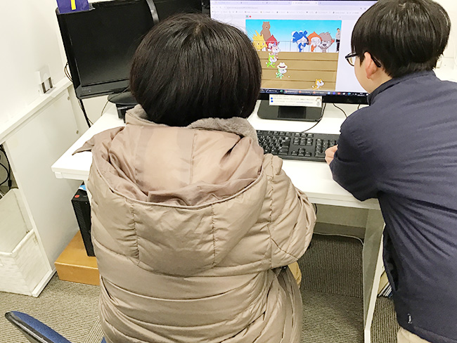 最後はお母さんに作品を披露。実際触ってもらいました。子どもたちから操作方法やコツの説明を真剣に聞き、ゲームクリアを目指すお母さんたち。
