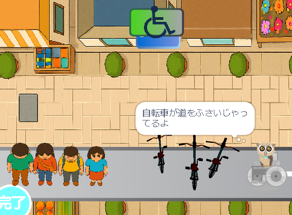 プレイヤーは、画面左下に用意されたアイテム(スロープ、移動ツールなど)を選び、ドラッグ&ドロップで問題を一つずつ解決していきます。すべての困難を取り除くと、車いすの方が安全に道を進むことができるようになります。