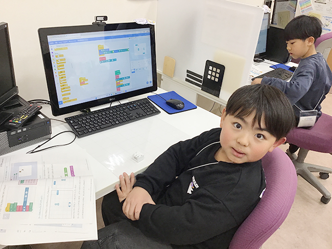 小学校低学年~中学年を対象に、タブレットで6ヶ月、ロボットとカードを使って3ヶ月の学習を経て、現在はパソコンを使ったロボットのプログラミングに挑戦中です。