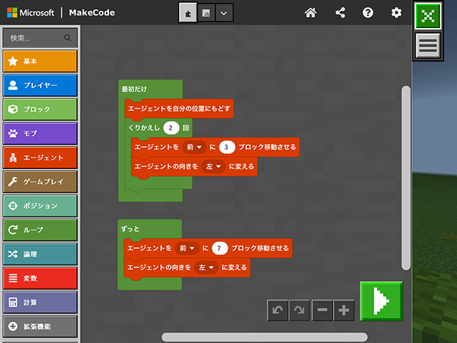 体験では、まず楽しさを知ってもらうために、答えを見ながらブロックをつなぎ、エージェントに階段を作らせるプログラムに挑戦します。