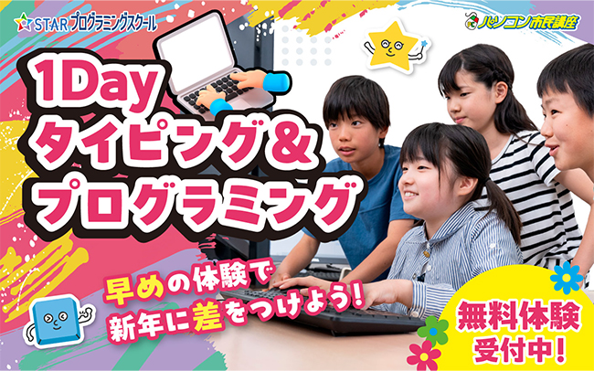 また、1日で楽しく学べる子ども向け「1Dayタイピング&プログラミング無料体験」を開催しております。