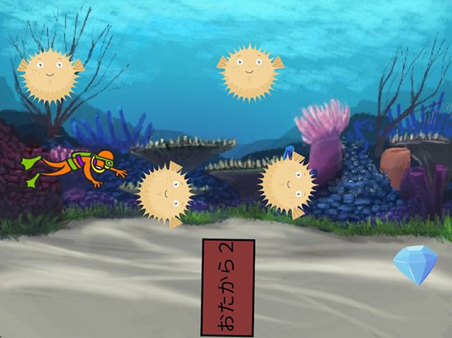授業でならったゲームをベースにして「ハリセンボン地獄お宝ゲットゲーム」大きいハリセンボンがスピーディーに上下左右に移動している中をすり抜けてお宝をゲットしなければなりません。