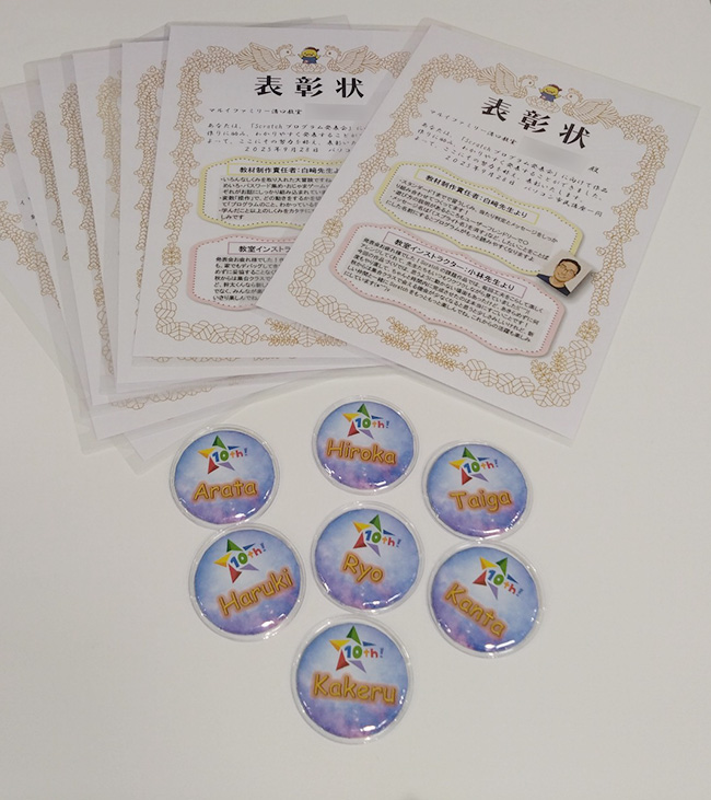 参加者だけがもらえる賞状と缶バッチを進呈している場面。