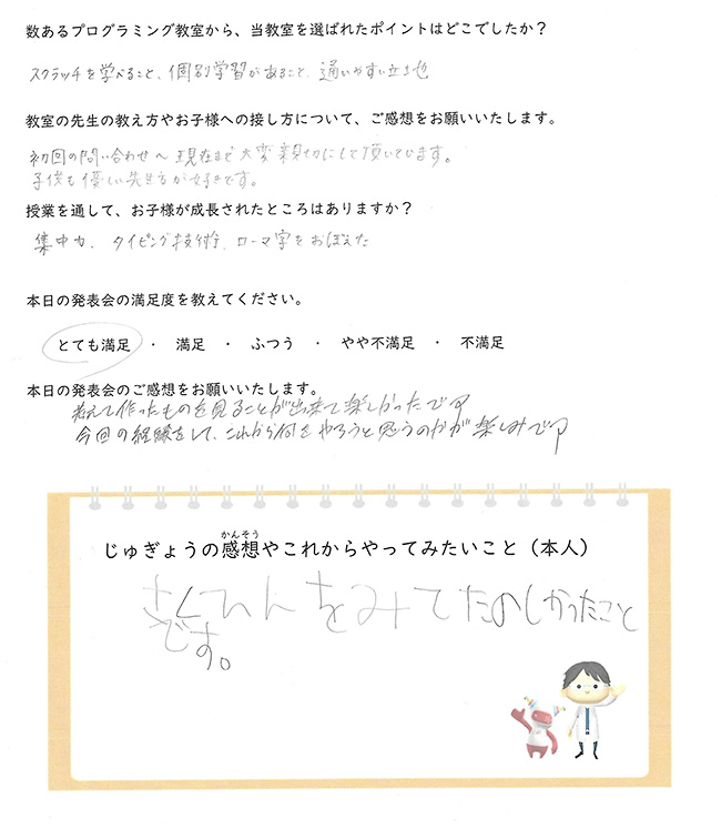 Q:数あるプログラミング教室から、当教室を選ばれたポイントはどこでしたか?