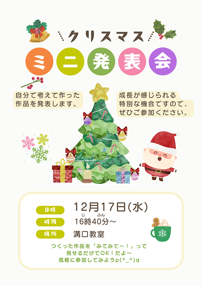 今回は集合クラス以外で学んでいる子どもたちにも、作品を発表できる場を作りたいという思いから企画しました。