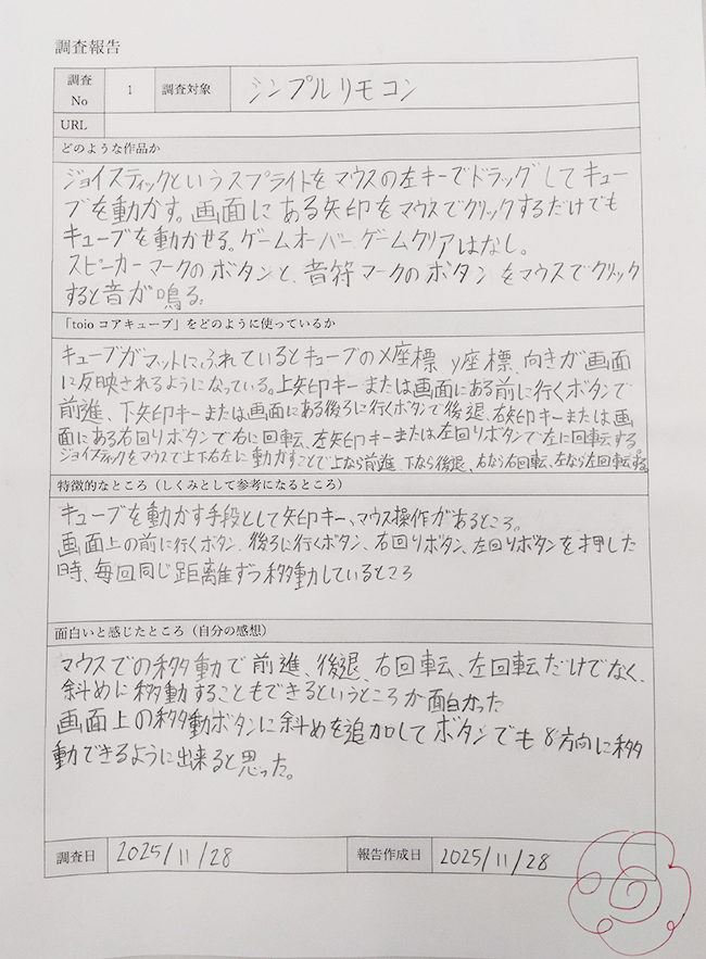 今回は、Scratchエクストラコース ロボット研究で学習中のSさんに、ソニーのロボットトイ「toio(トイオ)」のビジュアルプログラミングアプリ「toio Do」にある様々な作品を遊んでもらい、調査したい作品を自分で決めて調査し、その結果をまとめてもらいました。