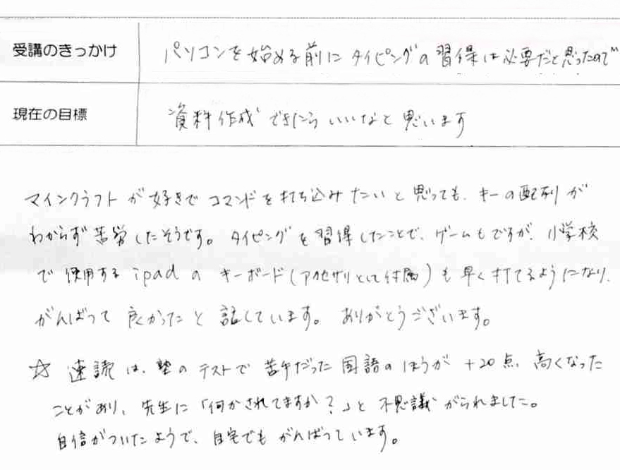 当初『パソコンを使用するにあたってタイピングは必要』と感じ、お教室へお越し頂きました。